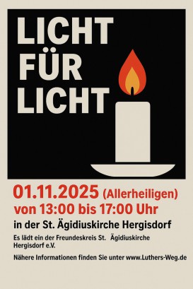 In katholischen Kirchen und jüdischen Synagogen brennt das ewige Licht. Es soll daran erinnern, dass Gott immer und überall anwesend ist. Auch in der evangelischen Kirche brennen Kerzen und zunehmend findet man auch Opferlichtständer, an denen Menschen gleich ihrer Weltanschauung Kerzen anzünden. Oft wird mit der Kerze eine Bitte, ein Wunsch, ein Anliegen verbunden, für das man beim Entzünden des Lichtes betet. Während man schon längst die Kirche verlassen hat brennt die Kerze noch immer und hält die Bitte lebendig. Auch in unserem täglichen Leben spielt das Licht eine wichtige Rolle. Es wäre dunkel und trist würde nicht an jedem Morgen die Sonne mit ihrem Licht den Tag erhellen. Und bald beginnt die Weihnachtszeit. Was wäre der Advent ohne Kerzen? Vor einigen Jahren wurden durch den Inhaber eines regionalen Autohofs Scheinwerfer an der Hergisdorfer Kirche installiert, um diese in der Weihnachtszeit anzustrahlen. Unser Freundeskreis möchte mit der Aktion „Licht für Licht“ diese schöne Tradition fortführen und bittet um Ihre Mithilfe. In unserer Kirche befindet sich ein Opferlichtständer, an dem jeder aus ganz persönlichen Gründen eine Kerze entzünden kann. Für jedes Licht bitten wir um 50 Cent. Den Erlös möchten wir verwenden, um die Stromkosten für die Außenbeleuchtung unserer Kirche in der Weihnachtszeit zu finanzieren.